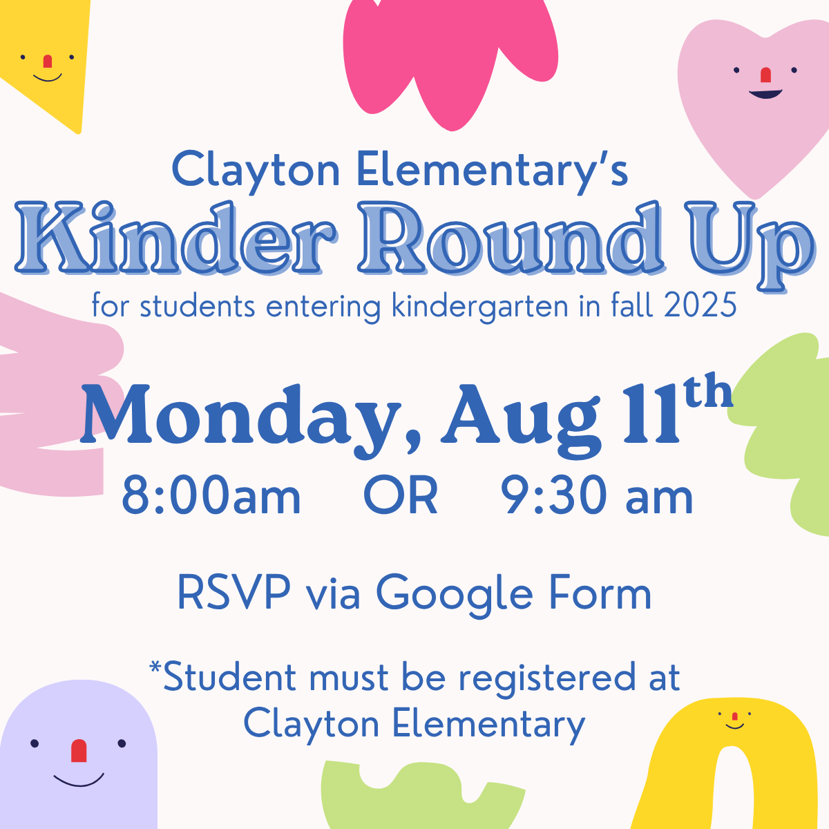 Your student needs to be enrolled at Clayton for Fall 2025 Kindergarten. Registered families should get an email with google form RSVP by July . If you haven't received an email by July, please contact Principal Karen McCollum: karen.mccollum@austinisd.org